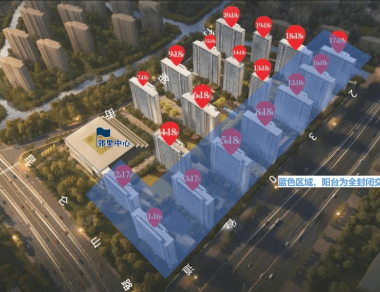 社区配置上,是清一色的16-18层小高层,南北间距大多为40-45米左右,临近230省道一排均为封闭阳台