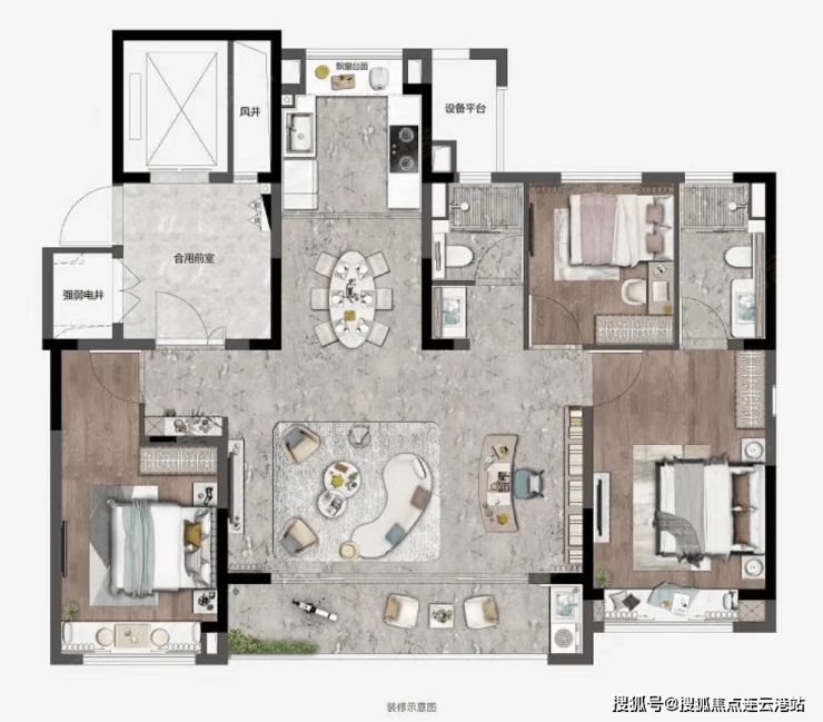 108㎡三居:单价约18000-21000元/㎡,总价190-210万/套,三开间朝南设计
