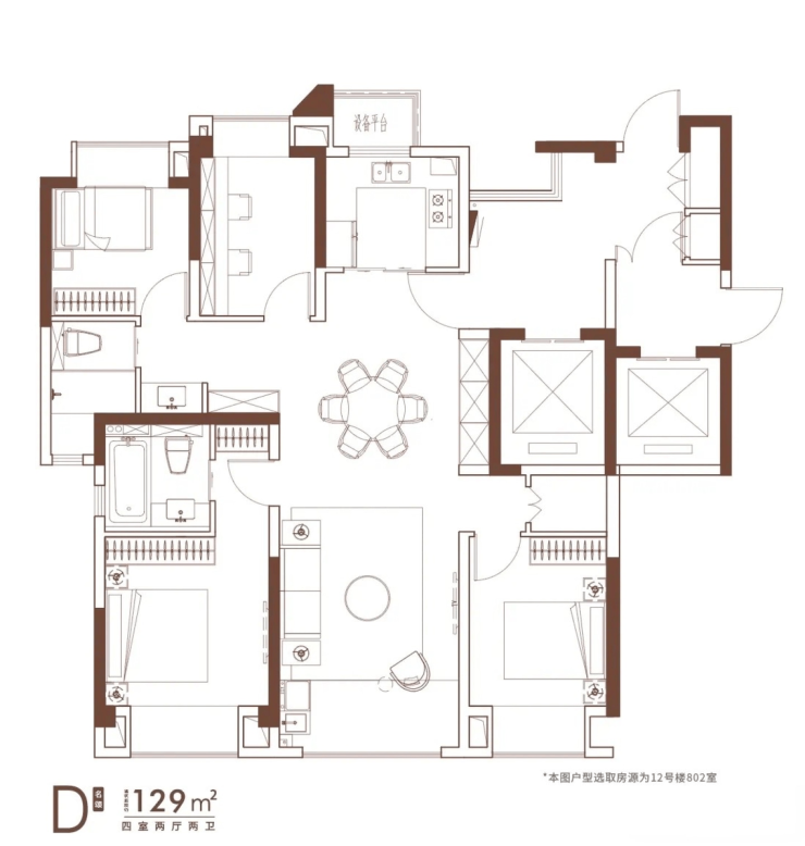 129–130㎡ 9,500 – 10,800 122万 – 140万 主力户型,四室两厅,南北通透,市场成交主力
