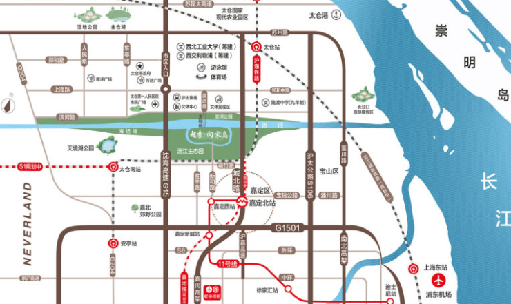 沪太双城无缝衔接 :项目南门直通上海嘉定区新和路,北门连接太仓富达路,形成"出门大上海,归来金太仓"的独特生活模式,满足沪太双城通勤需求。