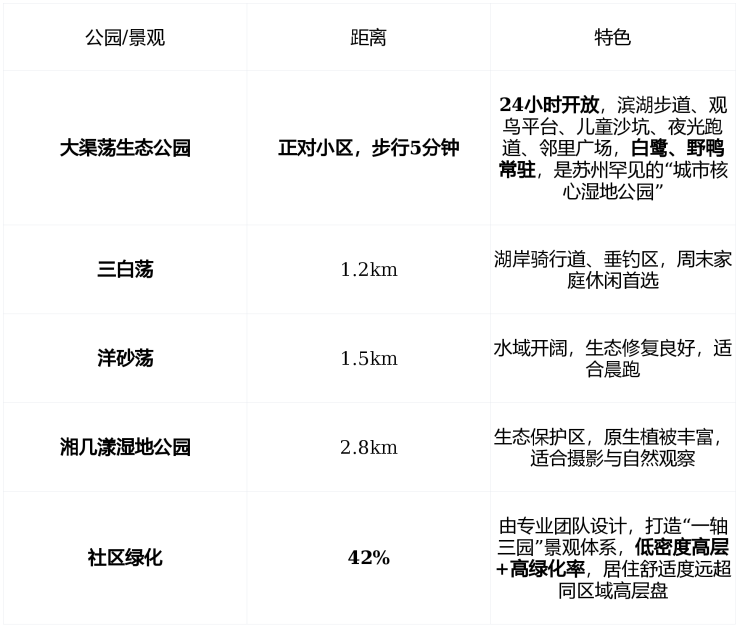 正对大渠荡生态公园 ,步行5分钟可达湖岸步道, 绿化率42%、水域覆盖率40% ,是苏州少有的“城市蓝绿带”住宅。