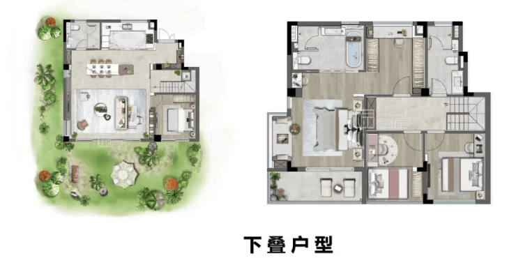 下叠建面180-183㎡,带私家庭院,最大花园可达234㎡,分层布局,动静分离。