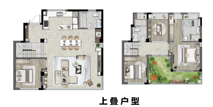 上叠建面158-160㎡,带L型露台,打造空中花园,客餐厨一体,空间通透开阔。