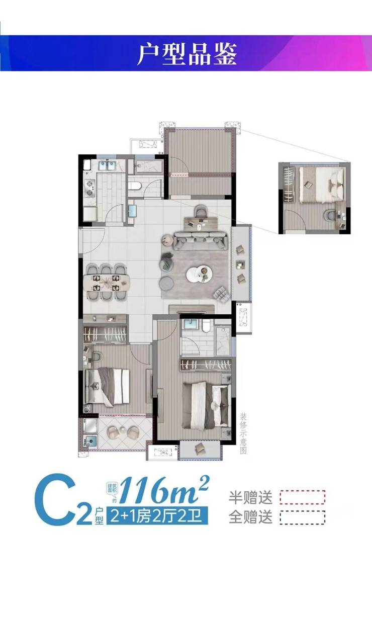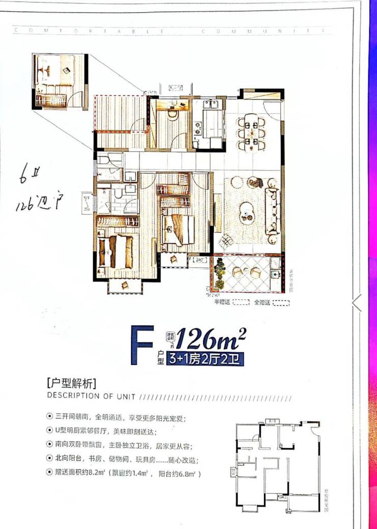 户型特色:90㎡小三房得房率高,117㎡以上户型配7.2米横厅