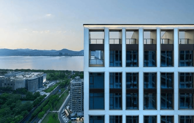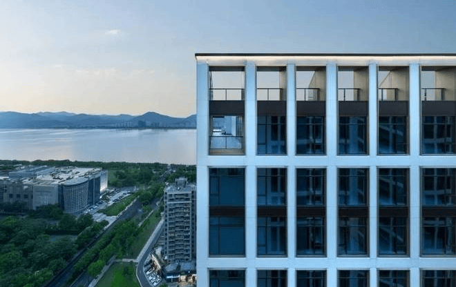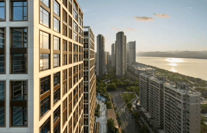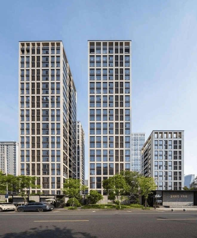 项目以“金镶玉”为建筑设计灵感,采用白色铝板镶嵌香槟金窗框,搭配LOW-E双层中空玻璃幕墙,形成油画框般的立面美学。这一设计甚至荣获ArchDaily设计大奖,成为滨江天际线的新地标。