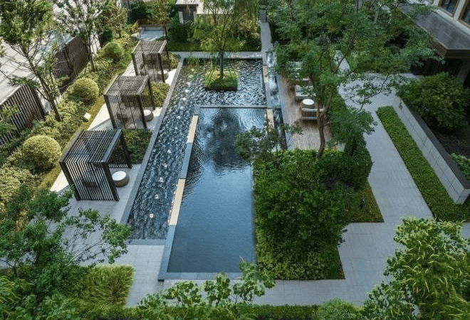 社区规划采用“三庭四院”围合式布局,以《春江花月夜》为灵感,打造筑庭、林庭、石庭与娱院、空院、水院、境院等景观体系,创造出富有诗意的居住环境。