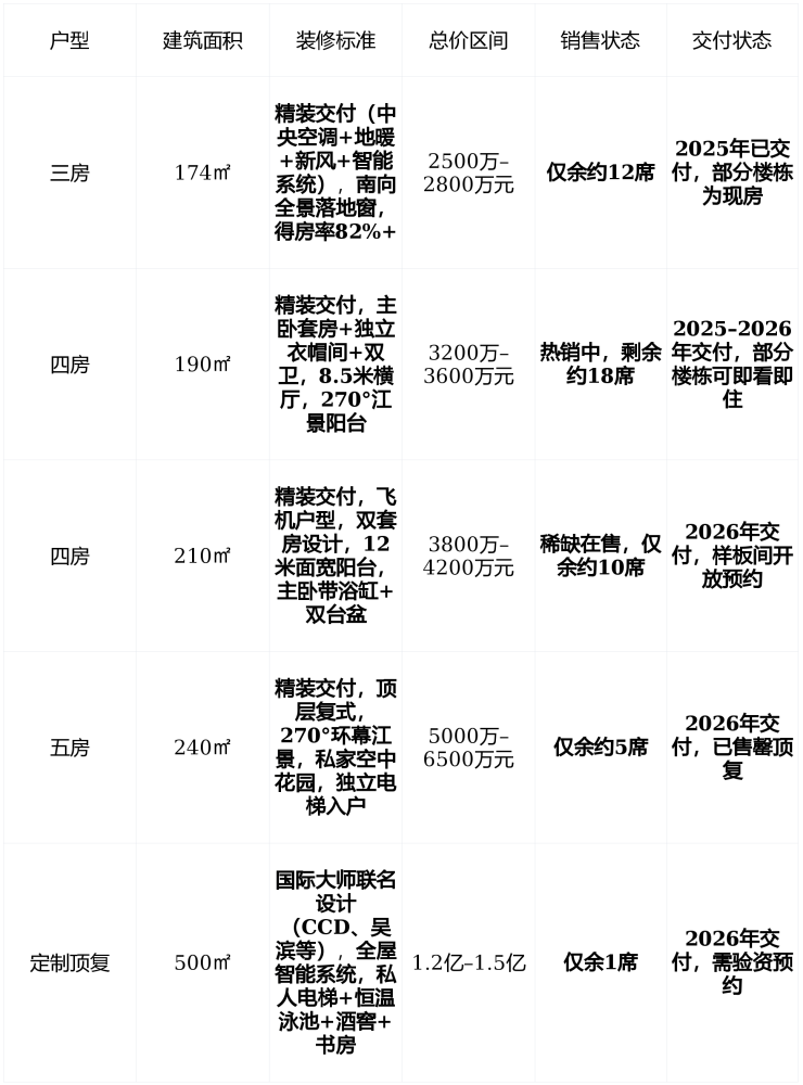 在售状态 : 建面174–500㎡三至五房 , 参考均价18万元/㎡ , 总价2500万–1.5亿 , 剩余房源仅约50席 , 洋房与顶复户型已售罄 , 2025–2026年分期交付,现为现房/准现房状态 。