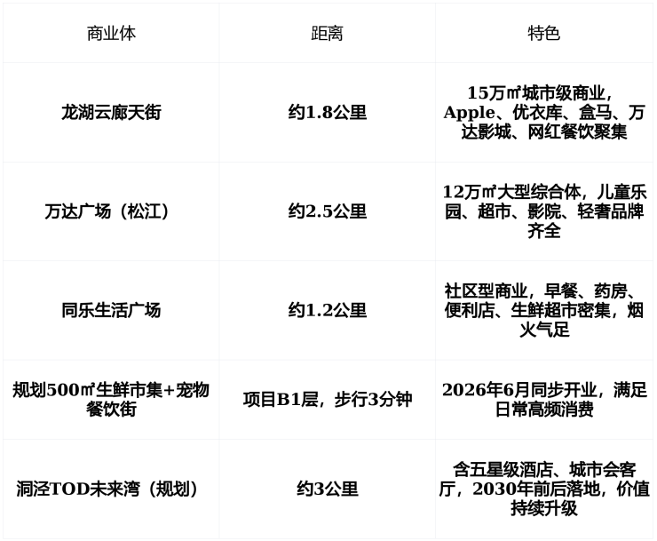 优势 : “社区商业+城市级商业+未来TOD”三重覆盖,生活节奏从容,不依赖单一中心 。