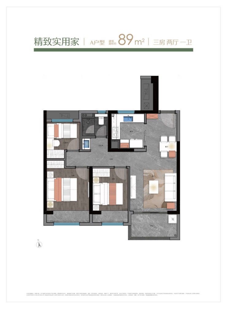 89㎡ 三室两厅一卫 竖厅布局+U型厨房,总价88万起