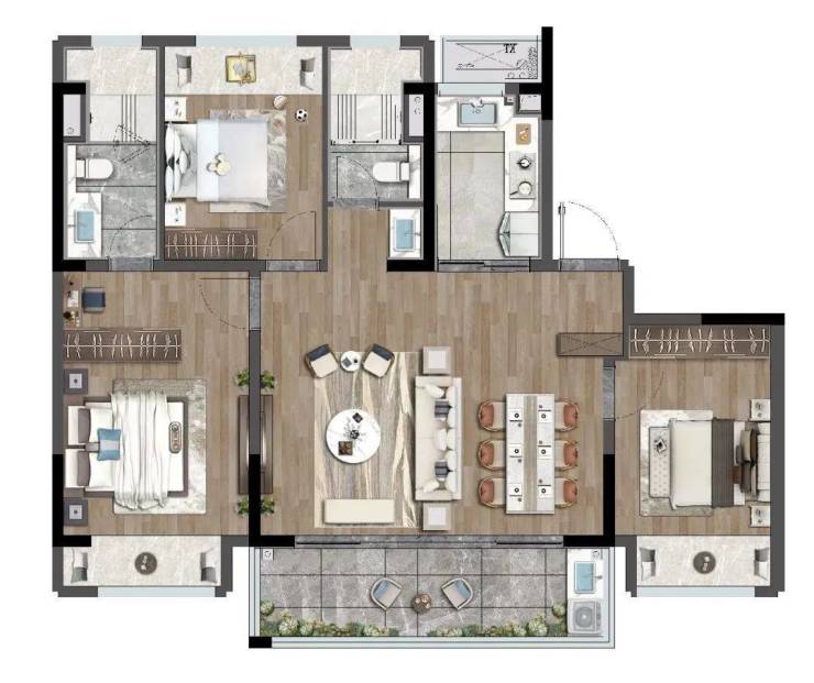 四居:129㎡(紧凑型)、134㎡(洋房专属,得房率72%)、143㎡(双套房)、173㎡(环幕视野)