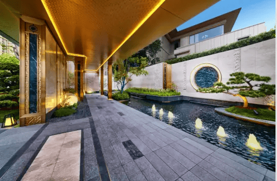 宋风门庭:满月景墙、液态大理石、凯撒灰奢石景墙,入户即入画;