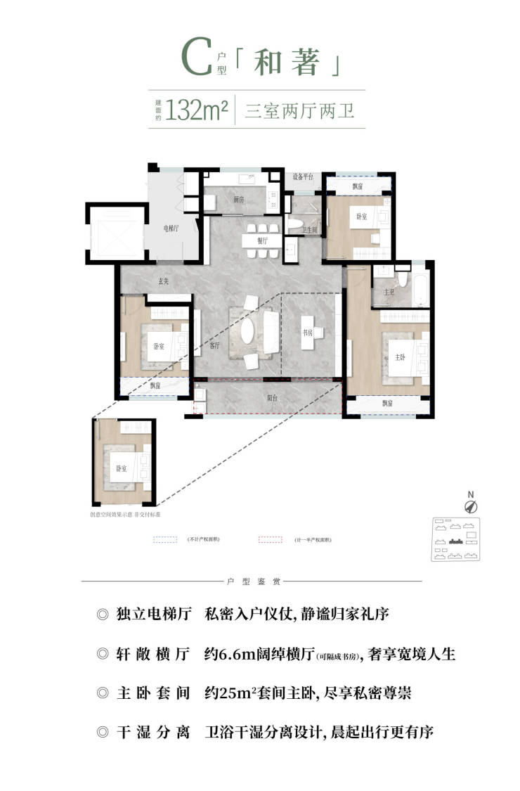 项目主力户型建面约 98–132㎡ ,均为三居室设计,满足不同家庭结构需求。