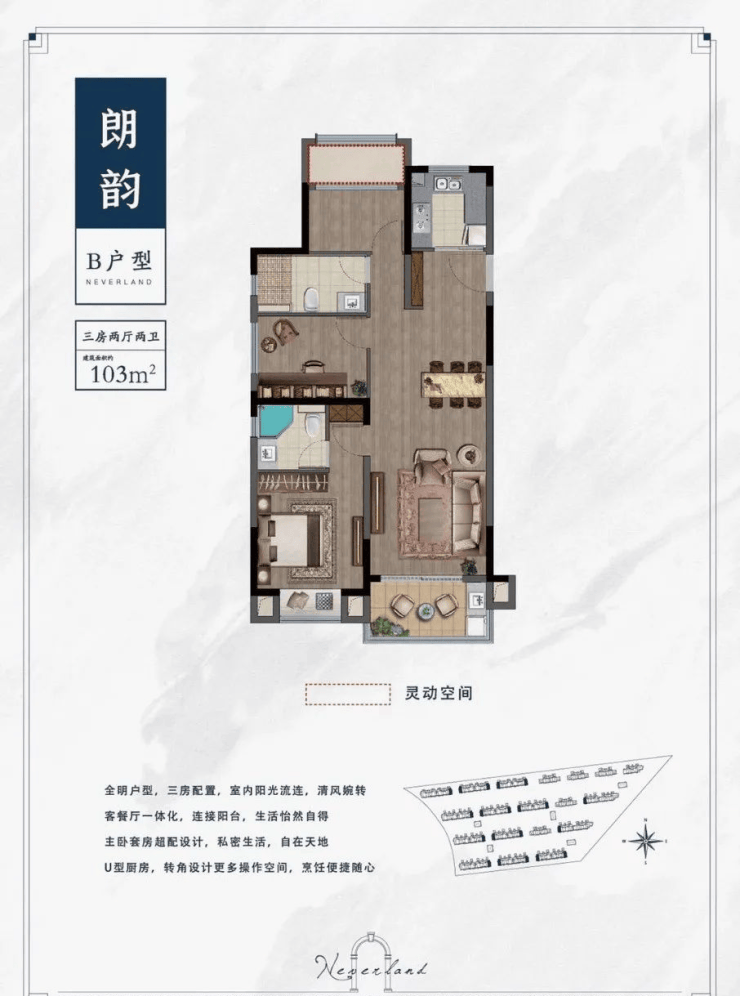 有点像手枪型的户型,客厅带有景观阳台,采光和通透性都会更好,百变的灵动空间,给居住者更多打造想象的空间~