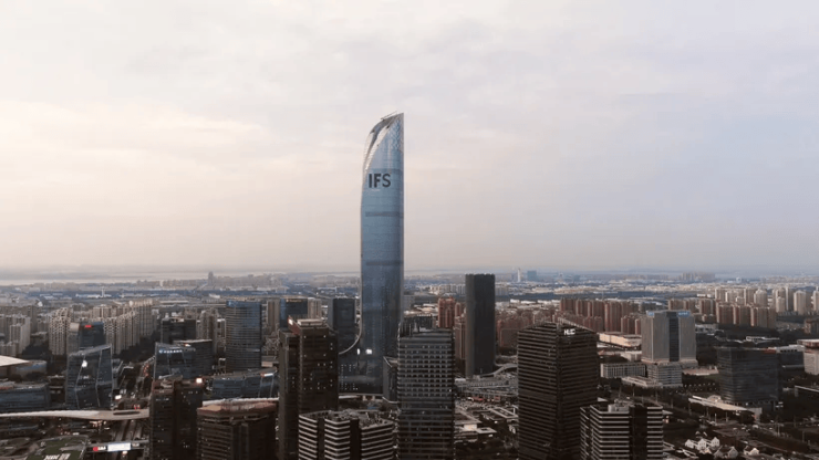 苏州九龙仓国际金融中心(IFS)是江苏省第一高楼,高450米、共92层,位于苏州工业园区湖东CBD核心区,西临金鸡湖,集甲级写字楼、奢华酒店、高端住宅与商业于一体,是苏州城市天际线的标志性建筑。