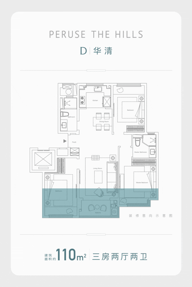 建筑面积约110㎡户型,拥有朝南三开间,南向双卧室,方正的格局里,随时可揽清风阳光入怀,眺目远望,既有社区绿意,亦有远山黛色,在大面积的采光之中,忽略空间的边界,拥抱自由的鲜氧。