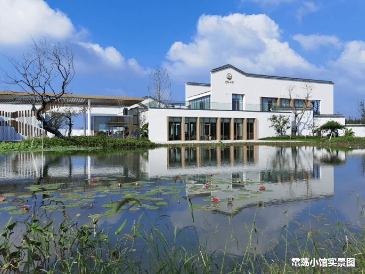 建筑美学:白墙黛瓦的素雅底色搭配深挑檐坡屋顶,大面宽落地窗与蓝灰色LOW-E玻璃实现室内外空间交融