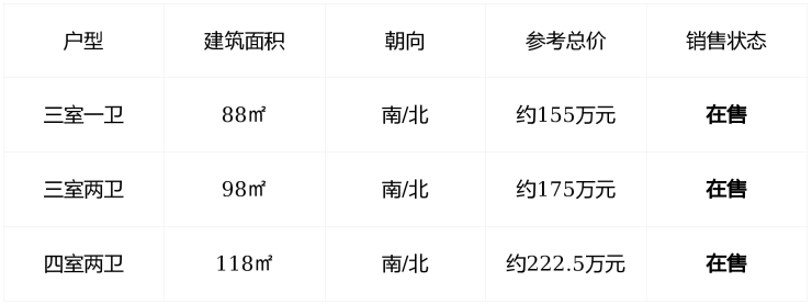 主力户型 :88㎡三室一卫、98㎡三室两卫、118㎡四室两卫