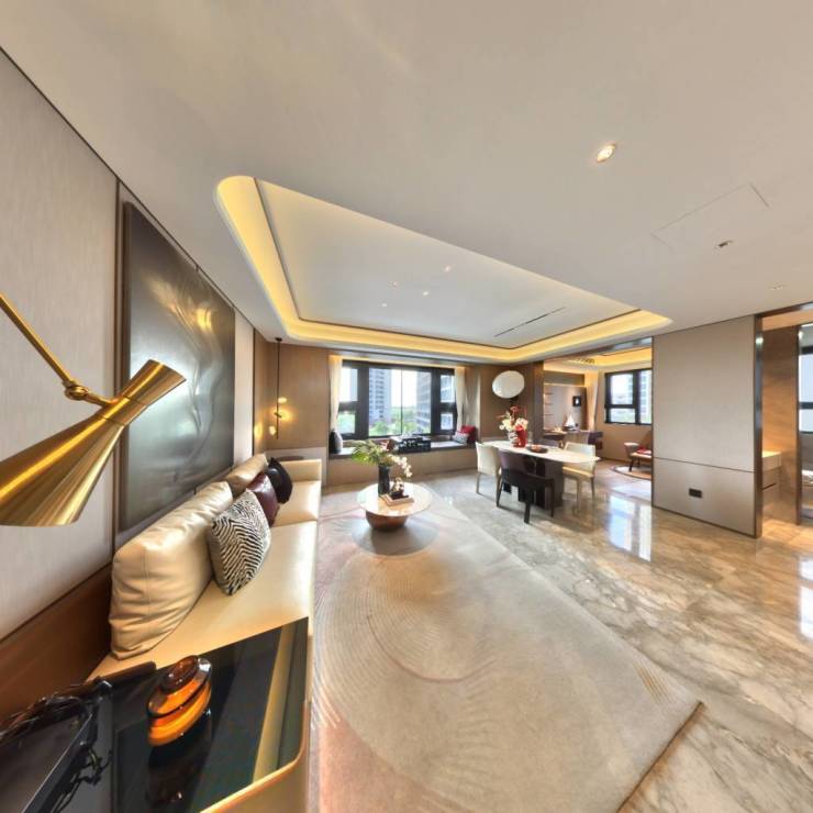 建筑美学 :外立面采用铝板、石材、真石漆与高窗墙比设计,搭配金色框线,呈现现代豪宅质感