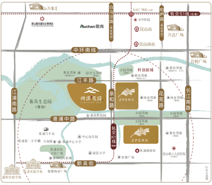 轨交规划利好 :紧邻规划中的 昆山K1线 (苏州地铁11号线延伸段),未来将在玉山广场站换乘S1线,实现“工作在上海、居住在张浦”的通勤模式