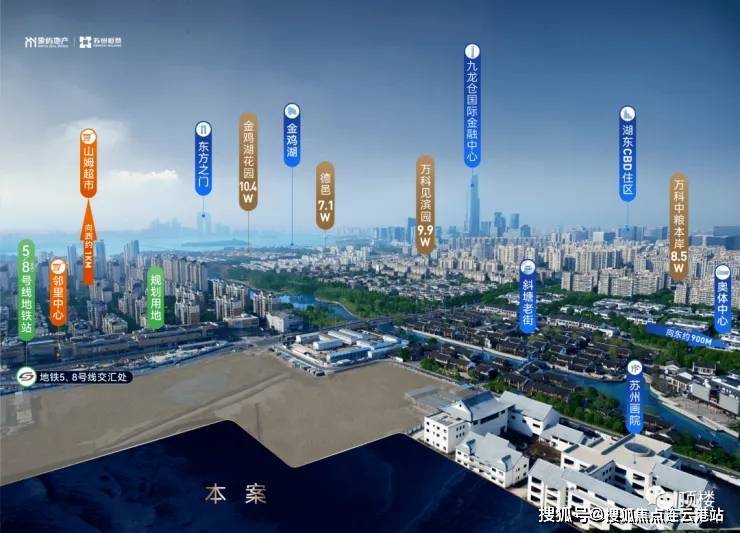 北邻十里斜塘河,东距金鸡湖景区约1.5公里,兼具水岸景观与城市绿肺资源