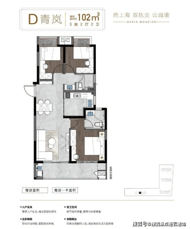 建面约102-106㎡:三室两厅两卫,三开间朝南,餐客一体连通阳台,总价160万-170万