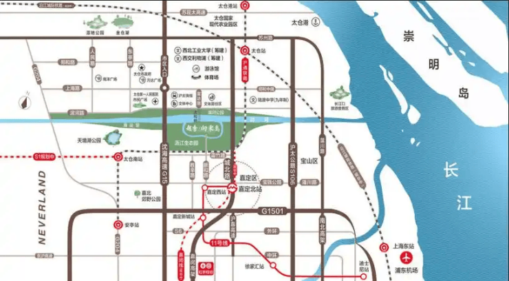 双城轨交枢纽 :项目南门直通上海嘉定区(新和路1558号),北门连接太仓新区(富达路1号),距规划中的嘉闵线十八港路站点仅800米,未来35min直达上海虹桥枢纽,实现“沪太同城半小时生活圈”。自驾5min可达上海嘉定,30min抵达上海市中心,周边G15沈海高速、沪太新路、闸北路、G346国道环绕,自驾出行高效便捷。