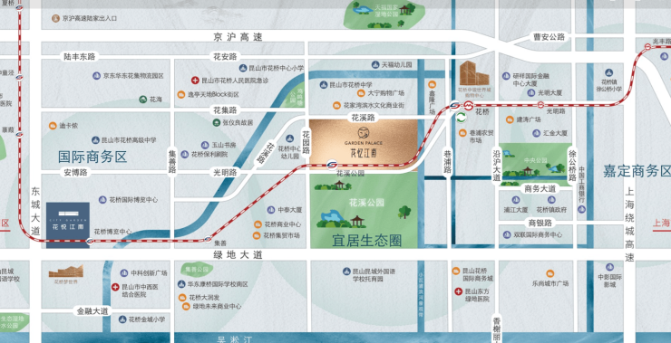 步行约156米(实测3分钟)直达苏州地铁11号线“花溪公园站”3号口,4站即达上海安亭,7站直达虹桥枢纽,全程无需换乘,是典型的TOD地铁上盖项目。自驾方面,紧邻绿地大道、京沪高速,15min可达昆山主城,30min覆盖上海嘉定、青浦区域^。