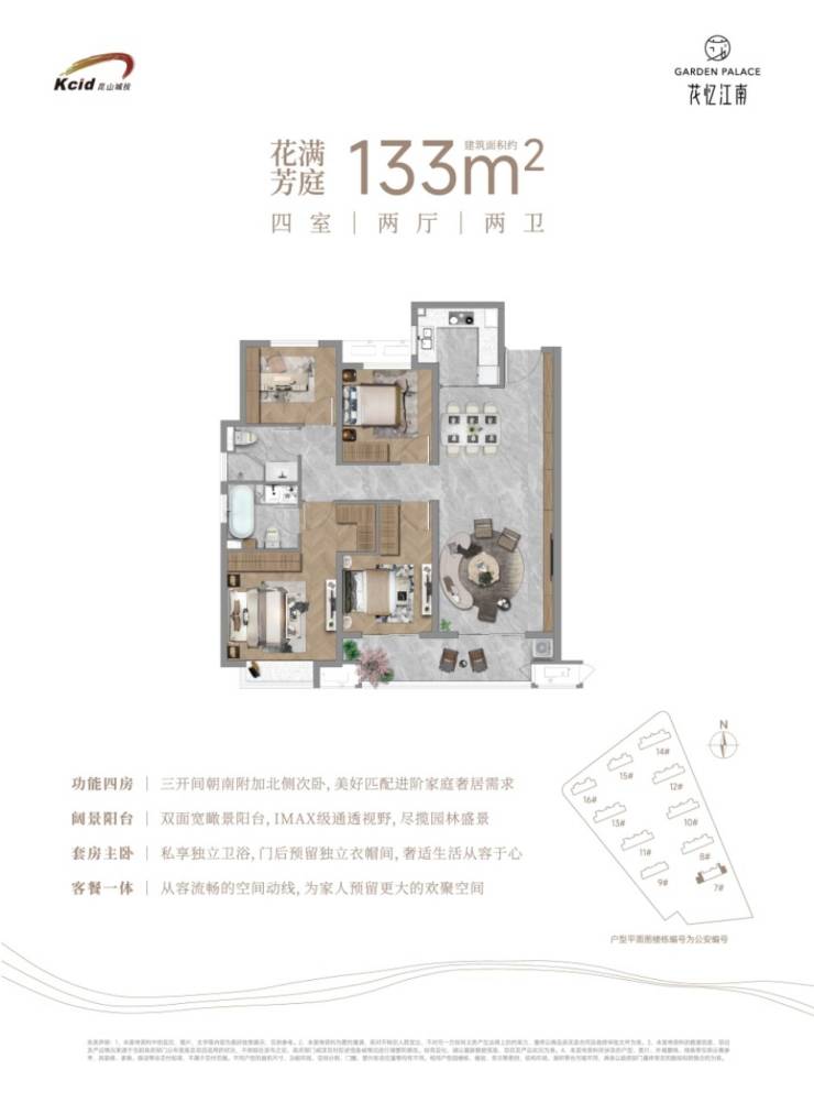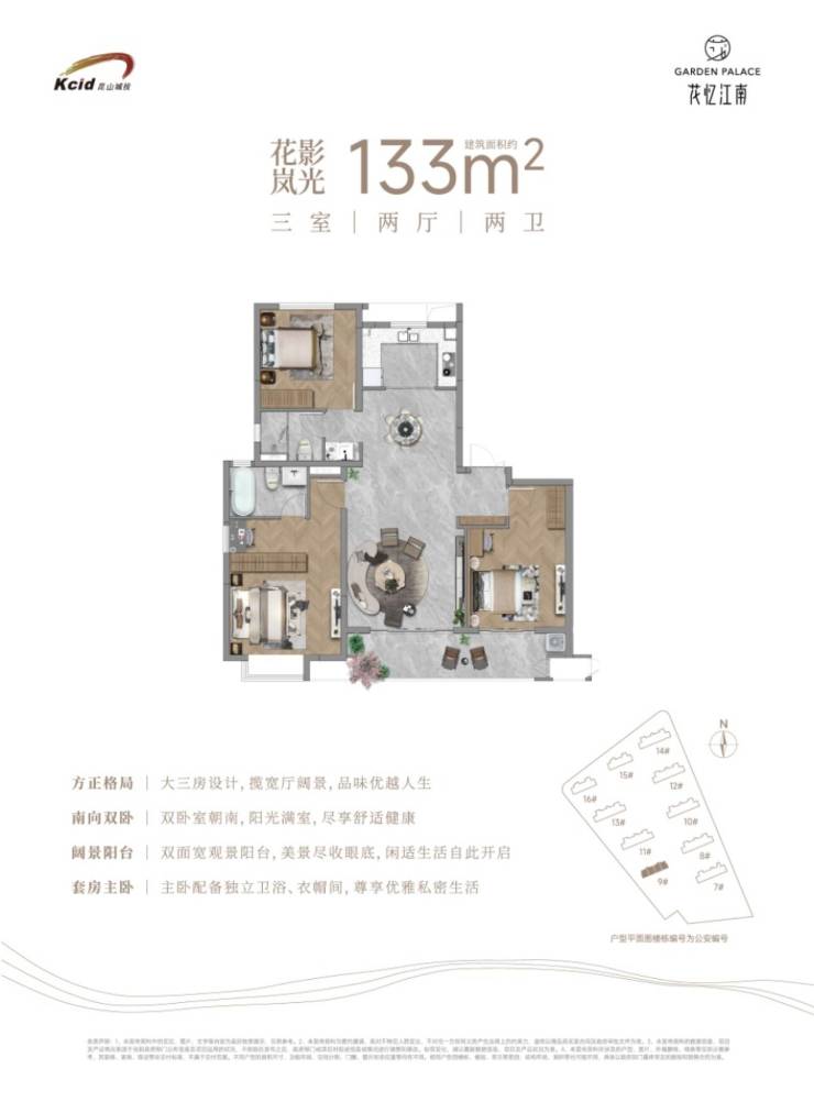 主力户型为建面约113㎡三房两厅两卫与133㎡三房/四房两厅两卫,均采用多开间朝南、南向双联阳台设计,采光通风良好。113㎡户型主卧带飘窗,可览园林景观;133㎡户型主卧为套房设计,配备独立卫浴与衣帽间,动静分区明确,适合三代同堂或二胎家庭^。