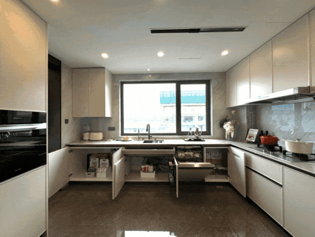 厨房满柜设计,不只有上方柜体拉篮、下方碗篮抽屉、调料抽拉柜,水槽下面的还专门做了一个下翻抽。