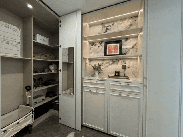 入户玄关有两组超大通顶收纳柜,钓鱼杆、宝宝推车、行李箱、鞋子等都能安排妥当;还在侧面增设了隐藏式800库。