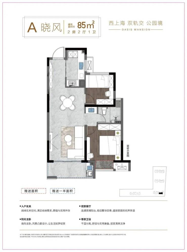 约80-85平方米两房户型:这是项目的入门级户型,总价门槛相对较低。户型设计紧凑实用,适合年轻夫妇或单身人士首次置业。客厅与卧室布局合理,功能分区明确,在有限面积内实现了较高的空间利用率。