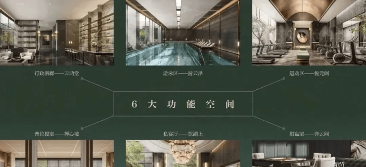社区公区:以私密低密改善生活为思考,打造1900余平社区会所空间-鸿湖荟,以东方雅序的手法融合了六大功能空间(行政酒廊、游泳区、运动区、普拉提室、私宴厅、棋。