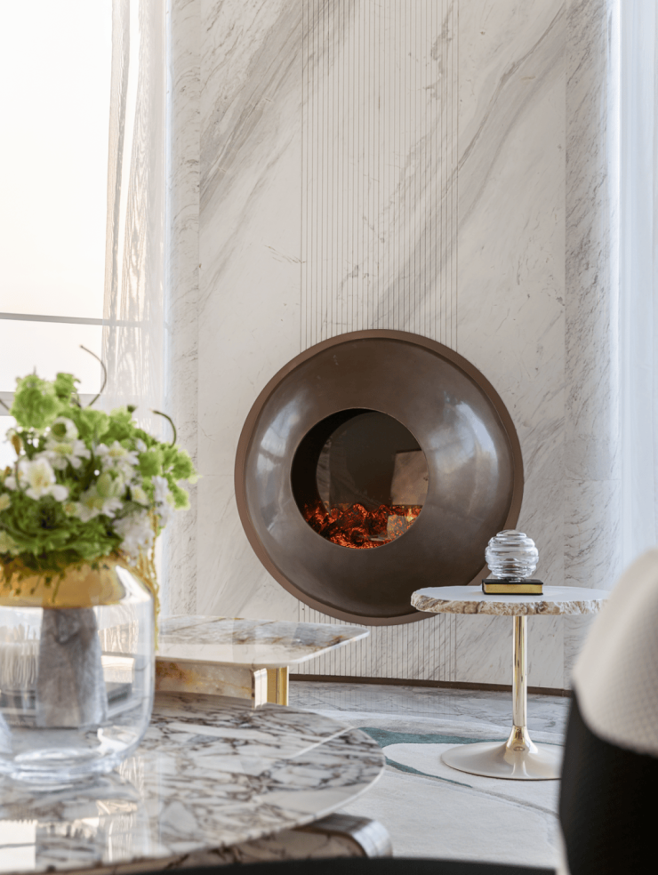 金属壁炉的灵感呼应着杭州国际会议中心的建筑形态