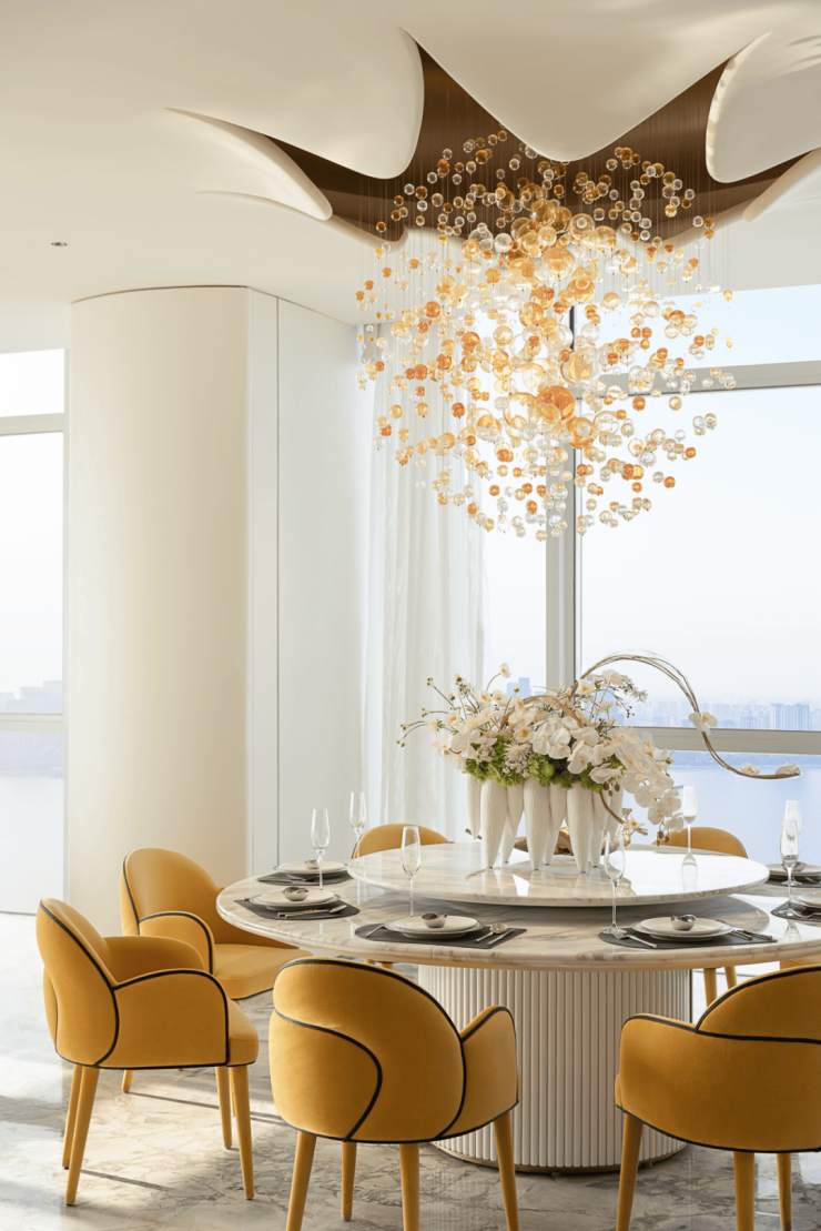 餐厅天顶一处模拟莲花绽放的形态,灯光开启,仿佛天光透过云隙。球形吊灯模拟阳光穿越天花的裂缝,洒落在水面,波光粼粼,空间的浪漫,如一场无声的剧目上演。