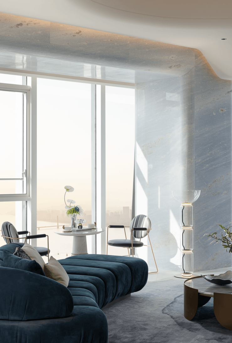 水榭是中国文人的天人合一的独有浪漫,透过写意石材的镜头,望向天空、眺望江景,随着时间、季节,光影的变化洒落在艺术家具上流动不息,突破空间功能的边界。