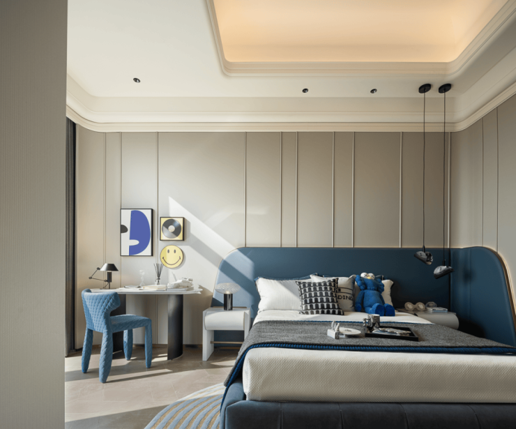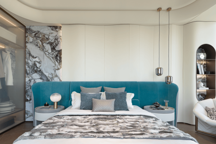 主卧主墙以江水潮涌意象,从窗外波浪曲线引进室内,用硬裱皮革方式呈现质感,于末端处激起浪花转化为跳跃的音符,以冷翡翠岩板作为收尾。