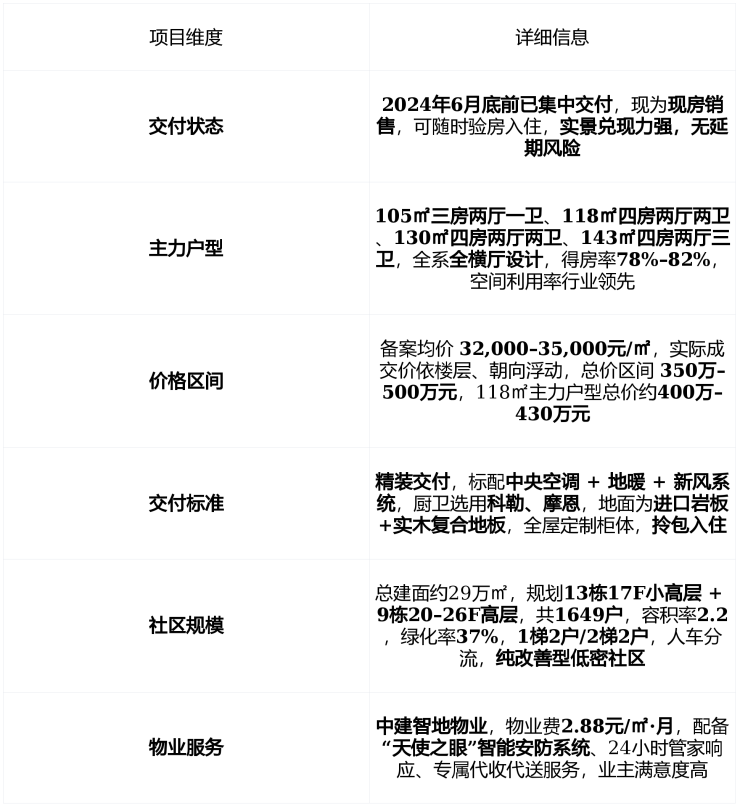 在售状态 : 2024年6月已交付 ,现为 现房销售 ,剩余主力户型为 105–143㎡全横厅光幕平层 ,备案均价 32,000–35,000元/㎡ ,总价 350万–500万元 , 无交付风险 。