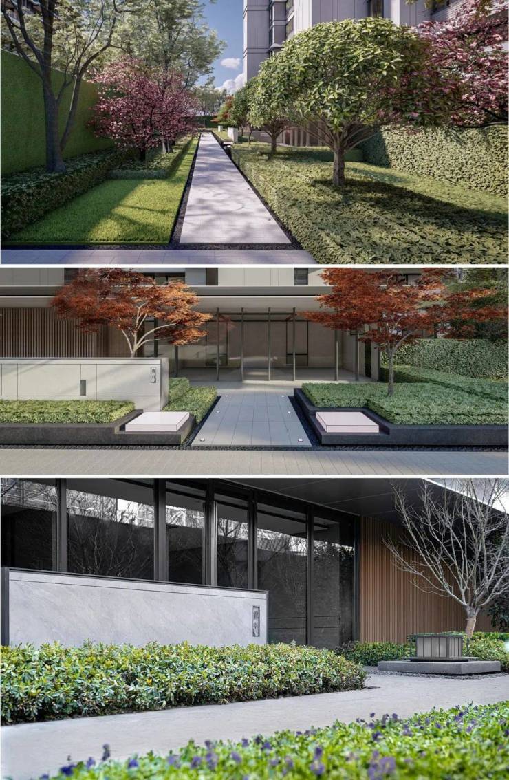踏入宅间巷道,眼前呈现出移步易景之妙。此时的景观空间,显得曲折而幽深。在设计手法上,多运用矮墙与灌木作为遮挡的屏障,上方有花木相互交织,巧妙地遮蔽天空,进而形成独特的框景效果。这种设计将人们的视线与体验集中在近地层面,使得空间呈现出虚实交错、藏露得当的状态,让人深切领略到庭院深深的韵味。再看入户门头,其主要构成元素为银色屋檐、落地玻璃、浅木格栅以及灰色院墙,整体给人一种细腻精致、素净温润之感。而在前景部分,通过矮垣对空间进行界定,有效增加了空间层次感。值得一提的是,此处的题记选取自无锡十八景,“自在飞花、月洞山林”的字样,完美再现了诗画园林所蕴含的优雅韵味 。