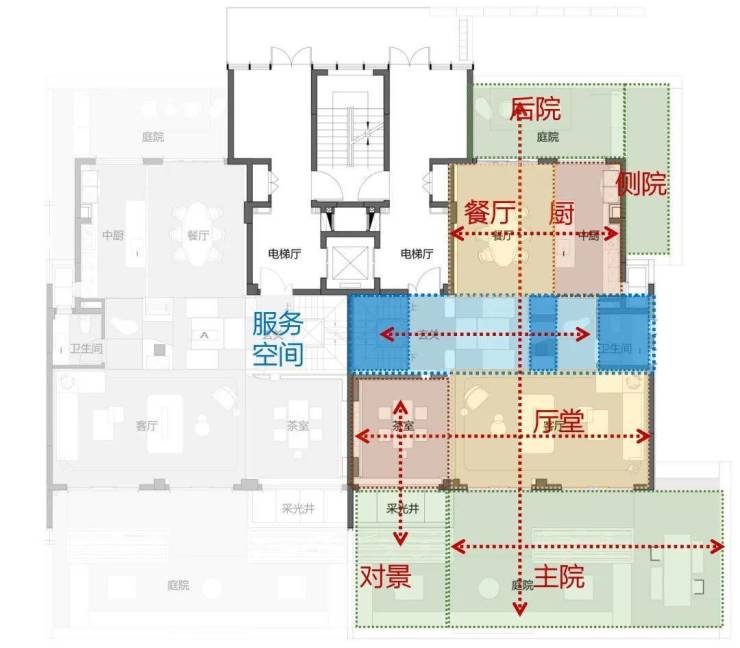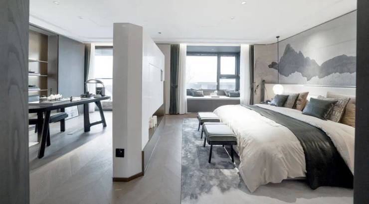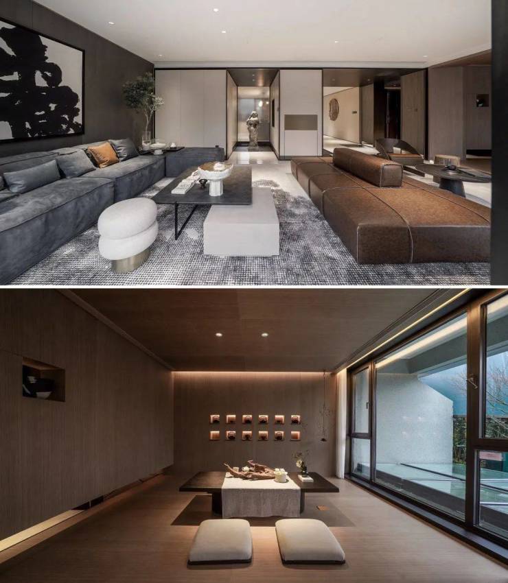 L型墅的下层作为主要空间区域,尺度十分充裕。这里有长达11m的宽敞厅堂,与之等宽的阳台相伴。我们将阳台看作叠墅的主院,它是厅堂向外的延伸部分,因其具备足够的尺度,营造出了浓郁的“庭院感” 。独立入户的半开敞梯厅,摇身一变成为住宅的前院。“前院—厅堂—主院” 构建起中轴空间布局。在这个空间里,左右两侧分别是卧室区与客卧区。整体空间不仅带有传统宅院那种井然有序的秩序感,还兼具现代生活所需要的灵动流动性。 ☎️售楼专线:4009983632 ☎️