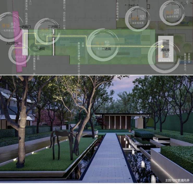 ,与主景空间形成对比,从而营造出幽深的入口氛围。主景——二进院围绕叠水展开主题设计,中间的步道仿若平桥相互连接,步道尽头设置了一座茶亭,此茶亭担当着