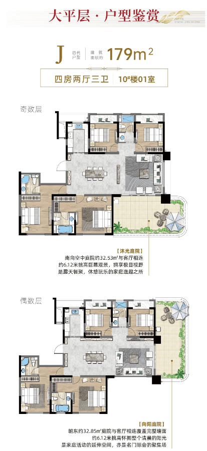 高层:约153㎡、172㎡、179㎡四居室,南北通透、主卧套房设计