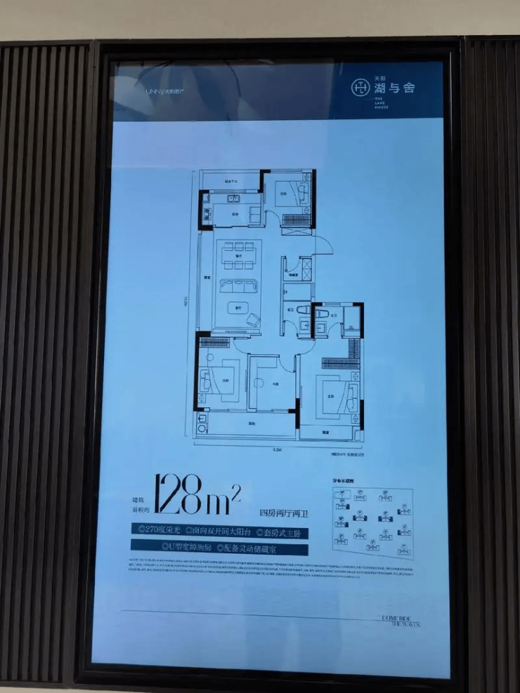 128㎡:四房两厅,空间阔绰,适合三代同堂,270°转角观景阳台,引湖景入室。