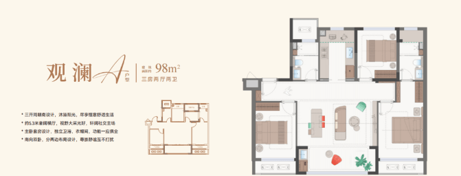 建面约98㎡户型,三开间双卧朝南, 约5.3米面宽横厅,采光通风优越,U型厨房动线合理,主卧大套房设计,带独立卫浴及衣帽间。