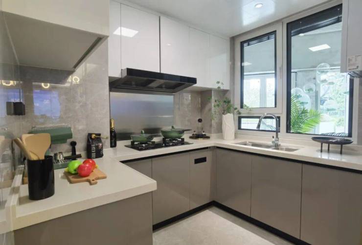 与朗阔餐厅相连的U型厨房,功能区域划分清晰,动线布局高效且合理,仅需小幅度的转身和移动,就能完成整个“洗、切、炒”的烹饪过程,多人同时操作亦互不影响。