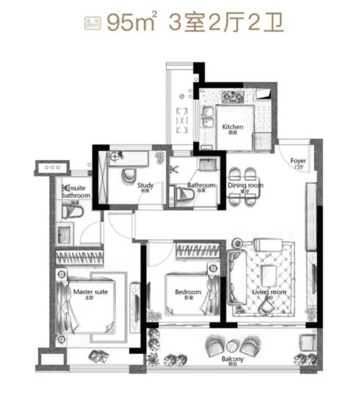 建面约95㎡三房两厅两卫,相较于同区域同系列产品,有着很大的优势。