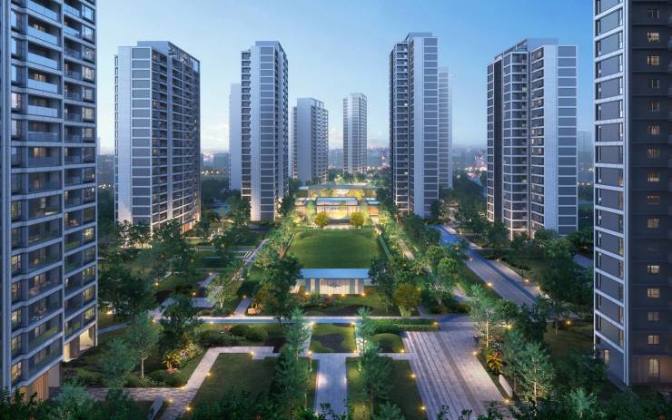 项目采用中央围合式布局,楼间距达60-100米(最大近100米),远超行业标准。由绿城景观打造的"六进归家森系九园"体系,包含迎宾花园、中央会客花园、春知学堂等九大主题园景,绿化覆盖率约40%