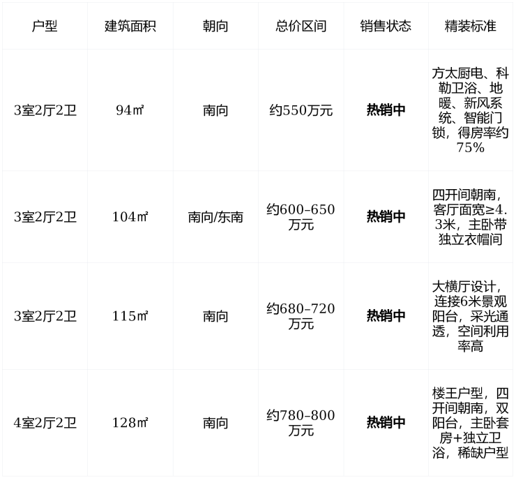 在售户型 :主力在售为 94–128㎡ 三至四房高层 ,总价 500–800万元 ,均价 58,000元/㎡精装交付标准约3,500–4,000元/㎡2026年底集中交付