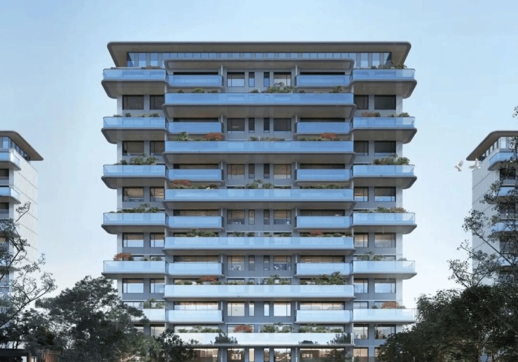 依循世界奢宅建造标准,以干挂铝板配合玻璃,立面上采用了曲线和弧面的设计,流线 美学勾勒立面造型;同时设置南北双阳台,享拥 360°视野,打造苏州湾至美天际线。
