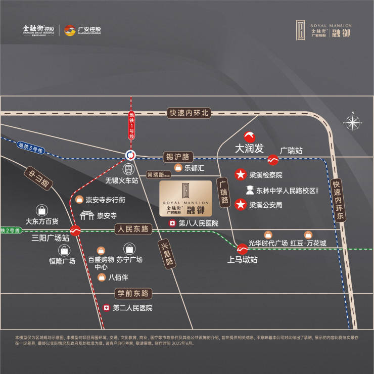 金融街广安控股融御是由金融街控股股份有限公司(国企)与广安控股两大实力企业联手打造的高端住宅项目,位于无锡市梁溪区广瑞路与瑞兴路交汇处西南侧。项目总占地面积约2.3万㎡,建筑面积5.6万㎡,容积率仅1.75,绿化率达30%,规划建设7栋总高10-16层的小高层和洋房,总户数363户,社区规模适中,居住舒适度高。