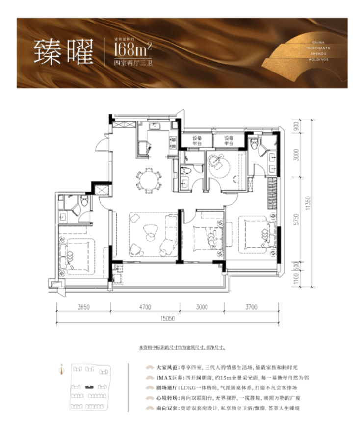 168㎡:四房两厅三卫,双阳台设计,约15米南向面宽,IMAX级采光,配置独立衣帽间、书房